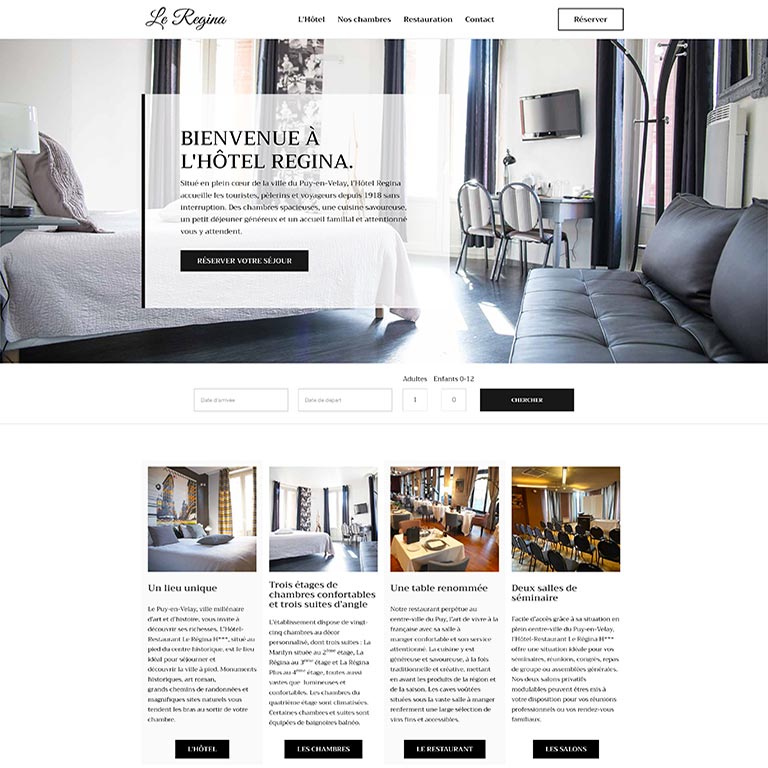 Refonte du site internet de l'Hôtel Régina, établissement atypique et véritable institution locale au Puy-en-Velay depuis 1918.