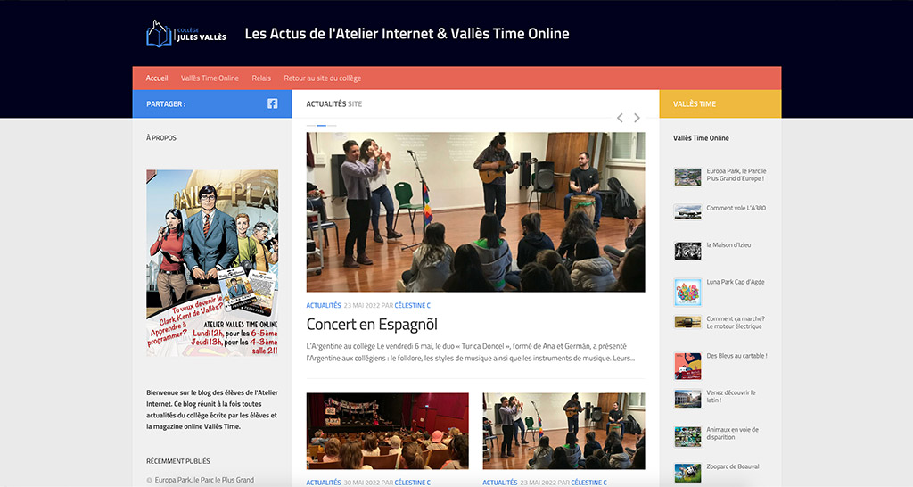 Animateur chaque lundi de l'Atelier Internet du Collège Jules Vallès. Ce projet est né en 2014 de l'envie de faire découvrir et comprendre Internet aux élèves. En travaillant à partir du site J'aime l'Allemand proposé par Mme Biwer à ses élèves en cours d'allemand, les élèves de l'atelier se sont tout d'abord initiés aux langages HTML et CSS, puis ont pu concevoir et coder certaines pages du site du Collège ainsi que le blog des actus créé en 2020 pour faire découvrir Wordpress aux élèves.