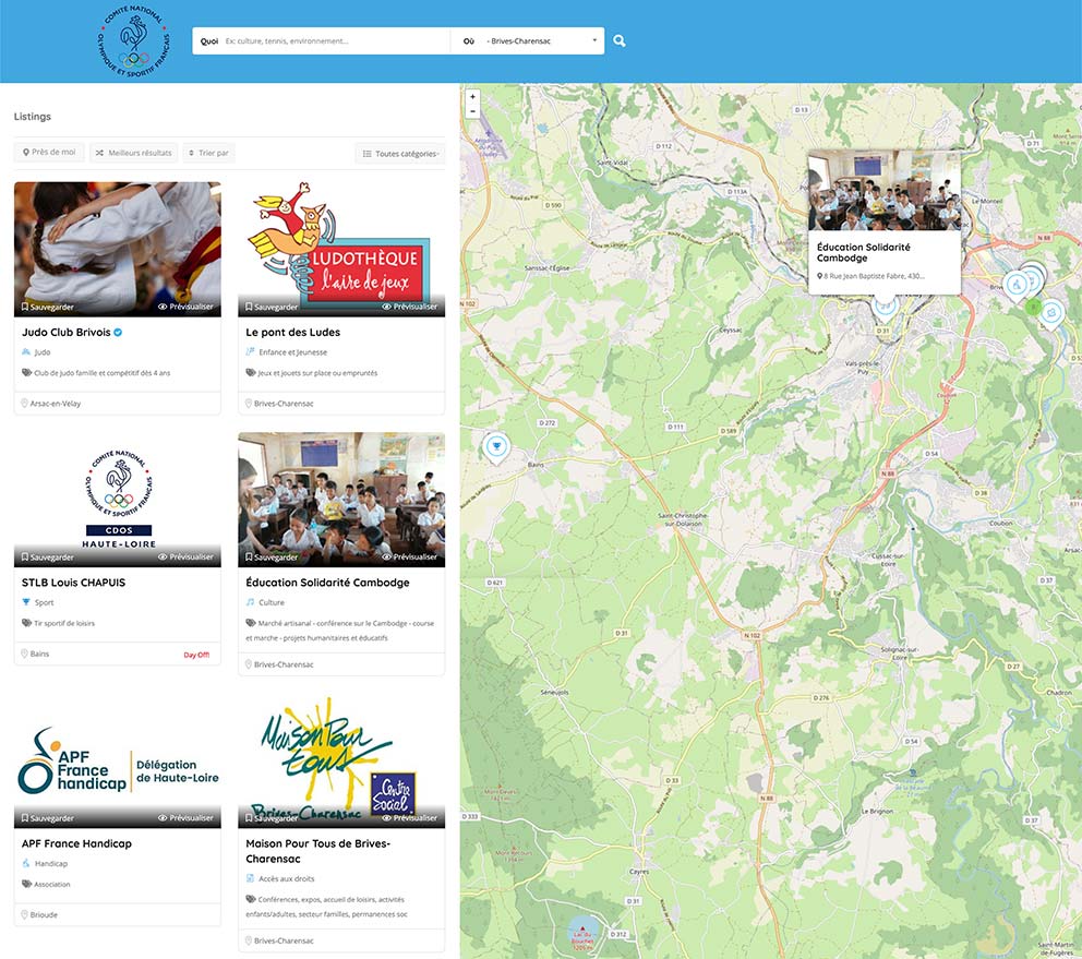 ☑ Permettre aux internautes de trouver en quelques clics les associations altiligériennes, répertoriées par ville, territoire ou thématiques en utilisant des catégories ciblées, des cartes interactives et la géolocalisation de l'utilisateur.